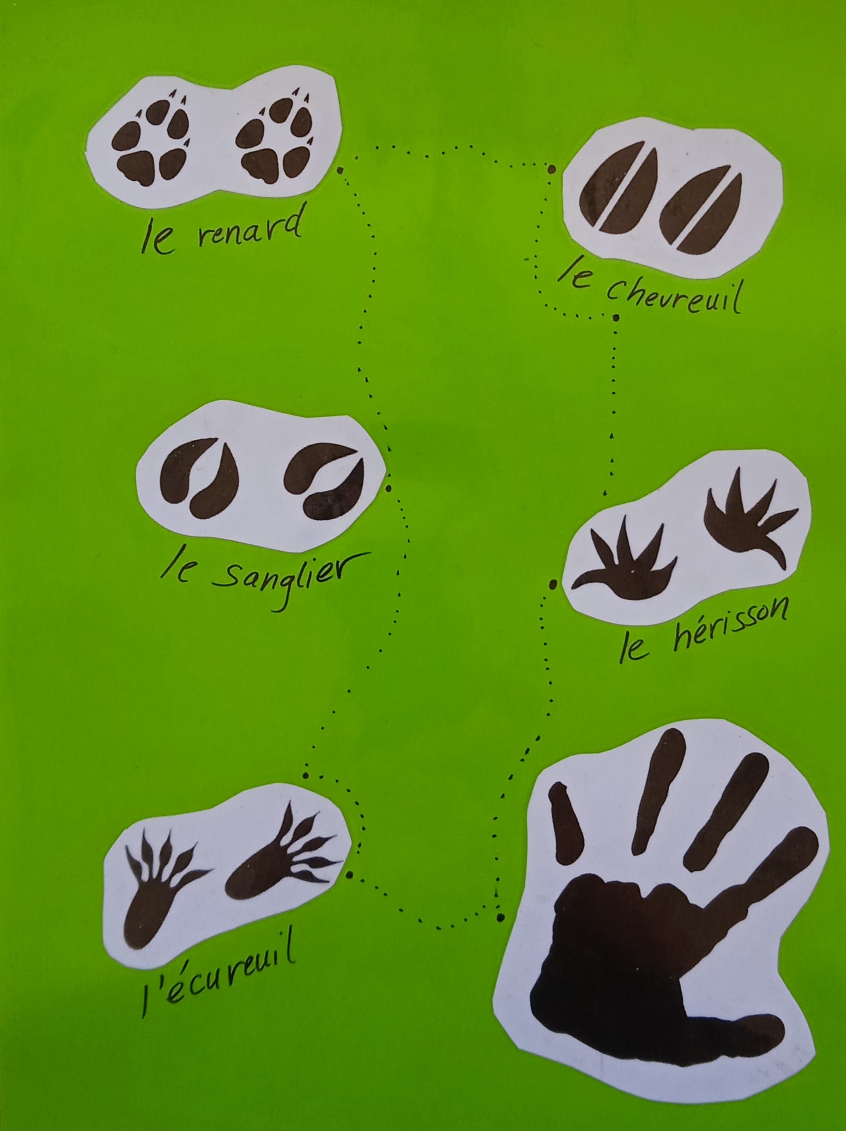 -Histoire de cinq animaux de la forêt : Sanglier, renard, chevreuil, écureuil, hérisson et leurs empreintes ( 15 min )